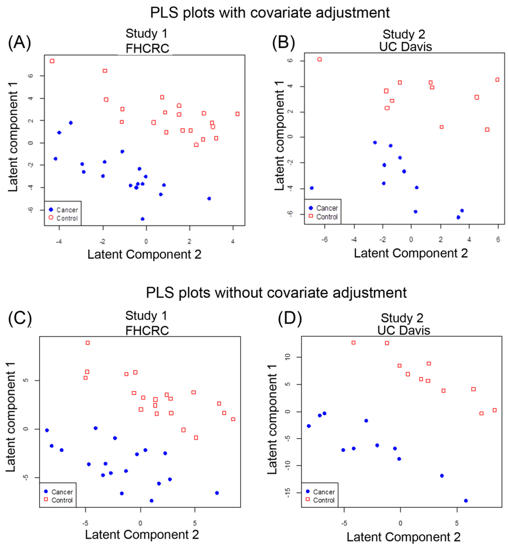 Multivariate analysis [23] using partial least square (PLS) [24] with linear discriminant analysis (LDA) with and without adjusting for age and gender was also performed to determine whether the blood metabolome as a combination of all metabolites identified in this study could discriminate cancer cases from control samples. PLS was used to reduce the 437 spectral peaks, each representing a metabolite, to a smaller number of latent components that distinguished cancer cases and controls and then determined which peaks were most influential in separating cases and controls as possible biomarkers. Metabolomic results from the cases and controls of Study 1 were separated by the first and second components when adjusted for age and sex (Figure 2A) that also showed good separation when the results were not adjusted for co-variants (Figure 2C). Based on leave-one-out cross-validation (LOOCV), we attempted to assess the performance of the metabolites to correctly identify the cancer cases. Sixty-three % of Study 1 samples were correctly classified , with 66.7% sensitivity and 60% specificity when two latent components were used to predict cancer status with adjustment for age and gender (Table S3A) and without adjustment for age and gender (Table S3B).