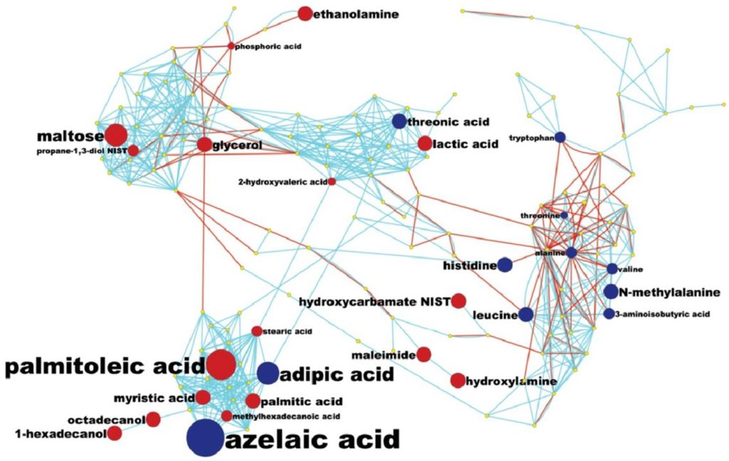 MetaMapp mapping of metabolomic analysis of lung cancer blood samples: a MetaMapp clustering metabolites based on biochemical reactant pairs in the KEGG RPAIR Database in addition to Tanimoto chemical structure similarity for identified metabolites that lack enzymatic information.