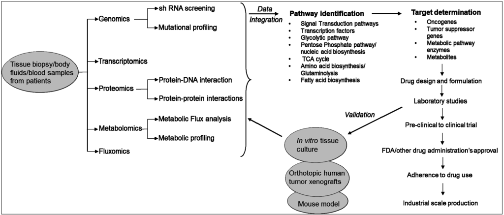 The metabolic pathways of a cell consist of a network of interacting genes, proteins and metabolite reactions [15]. Their functions are carried out by organized and hierarchical levels of information, which are controlled by intricate regulatory structures, mostly proteins and signaling molecules. This complex network provides dynamicity and robustness to the cell, offering the opportunity to dissect the complexity of the cell as a system and relate the genotype to its phenotype. These properties are regulated at several checkpoints in normal cells. However, in cancer cells, many of these regulatory networks are dysregulated and associated with uncontrolled growth and proliferation [15,16]. In fact, cancer cells adopt alternative metabolic pathways, and this has been reported by Otto Warburg almost 90 years ago [17]. At present, altered metabolism is considered as one of the hallmarks of cancer cells, and few studies showed that metabolic alterations are also linked to cancer drug resistance [12]. The altered metabolism is not caused by a single event. Instead, these are caused by multiple events, where the systems of the cells, comprised of genes, proteins and metabolites act in concert, to generate a certain cancer phenotype. Therefore, deciphering the underlying causes of disease pathogenesis and response to therapeutic targets require a holistic approach, like systems biology, in order to identify new molecular targets to treat disease or to correct altered metabolic networks in cancer [13,15]. In this review, we will briefly discuss the technologies, especially systems biology approaches that are used to identify dysregulated metabolic pathways in cancer cells followed by findings on the drug resistance phenotypes that are associated with altered metabolic pathways in cancer cells, and finally discuss some of the related, anticancer drugs that are currently at the clinical or pre-clinical stages of development.