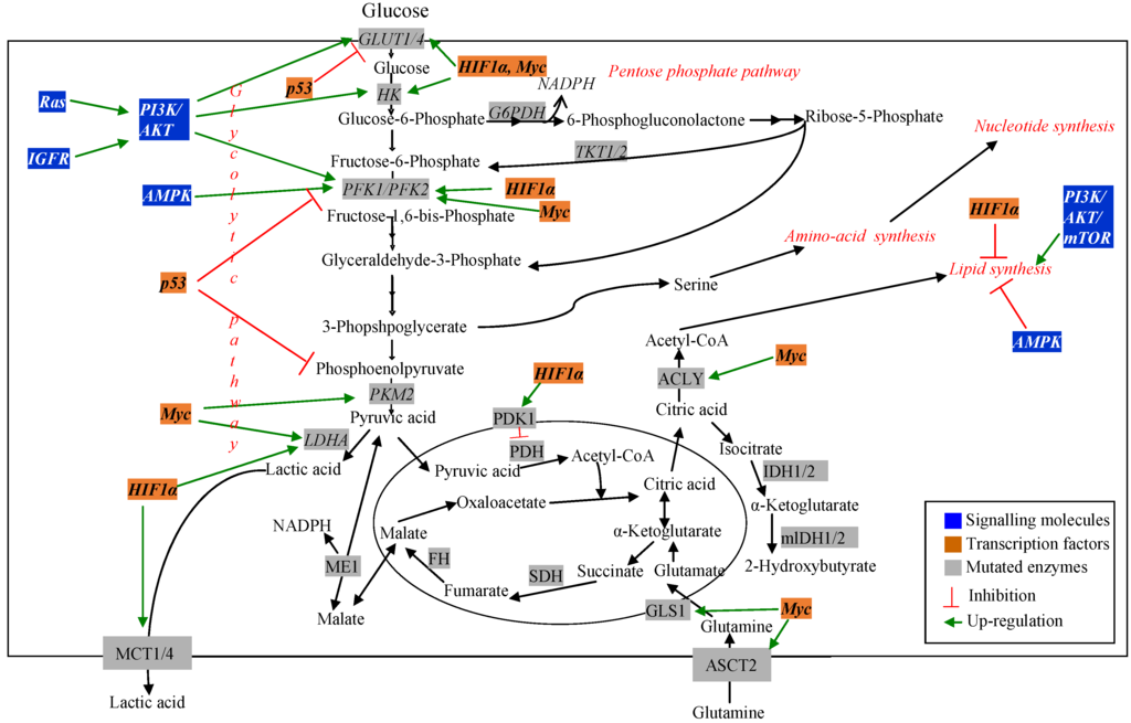 A number of transcription factors act as oncogenes and activates transporter proteins and enzymes of the glycolytic pathway, pentose phosphate pathway, TCA cycle and amino acid and fatty acid synthesis pathways [38]. Some of these are discussed below: