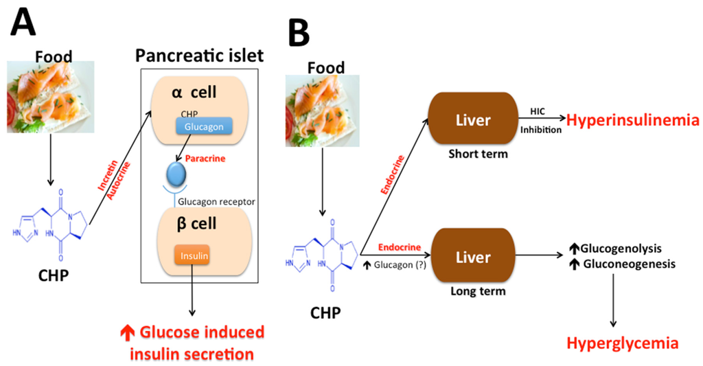 In Figure 1, we have made a graphic attempt to visualize the complex role of CHP in controlling insulin secretion and glucose both in short and long terms at the level of pancreatic alpha and beta cells and liver acting as incretin, as well as autocrine, paracrine, and endocrine mediators. While our assumption of CHP stimulation of glucagon secretion remains to be examined, human beta cells express functional glucagon receptors which can, similar to incretin hormone receptors, generate synergistic signals for glucose-induced insulin secretion [159,160,161].