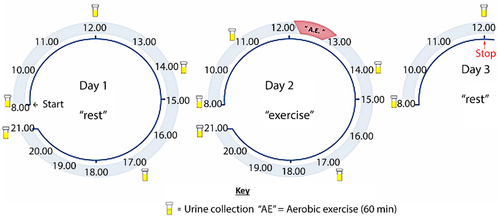 Each participant visited the laboratory on two separate occasions to complete two cycling exercise trials. Trials were separated by at least five, but no more than 10 days. The first trial was an incremental exercise test until exhaustion in order to determine aerobic capacity (VO2max) and the second was a 45 min submaximal exercise test. Urine samples were collected the day before, the day of, and the day after the submaximal exercise test (Figure 1). Participants were asked not to exercise 24 h prior to the maximal test and for the duration of the urine collection period other than the submaximal trial. They were also asked to refrain from the consumption of alcohol 24 h before each test, caffeine for 6 h before testing, or consume anything other than water for 3 h before testing.