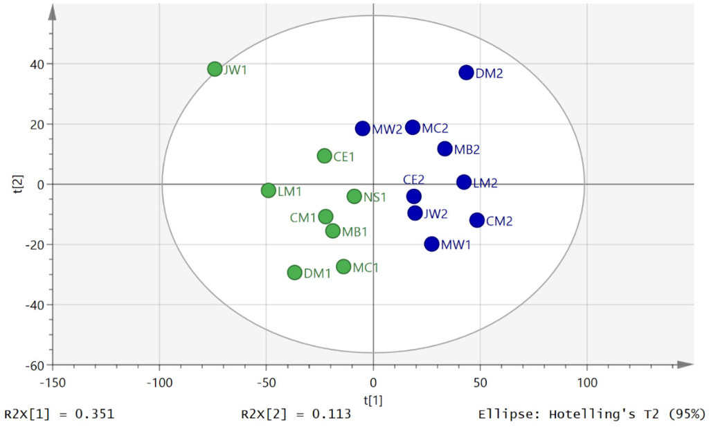 Separation of D2S1 (blue) and D2S3 (green) samples by using OPLSDA. R2X (cum) 0.35, R2Y (cum) 0.99, Q2 (cum) 0.77), three components). Based on 3078 features.