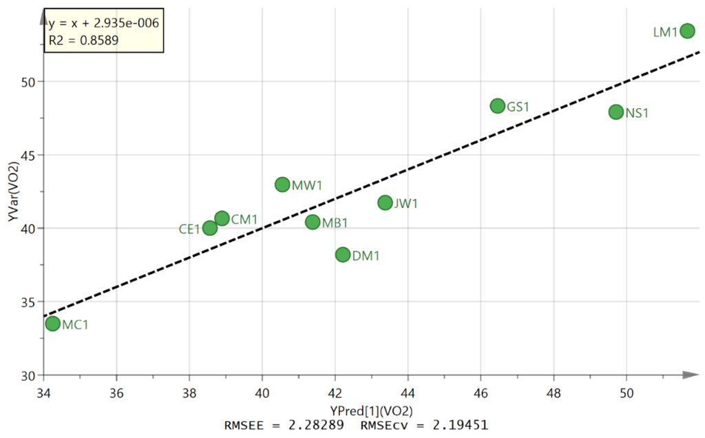 This simpler treatment produces a plot with R2 = 0.654. Although the R2 value for this plot is not as good as the peak area normalised to individual metabolic output this gives some confidence that the observation is not an artefact of the data pre-treatment which introduces additional smoothing into the data. Thus, OHA shows some promise as a predictor of VO2max.