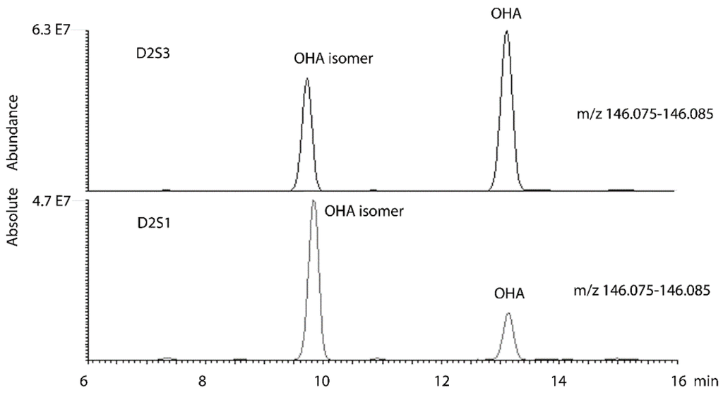 Extracted ion trace for OHA isomers in urine comparing a pre- and post-exercise sample for samples D2S1 and D2S3 for a subject with VO2max 53.4.