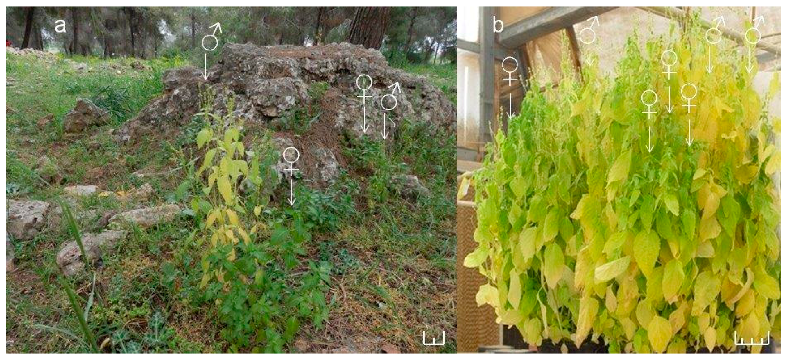 Mercurialis annua female and male plants in nature and controlled conditions. Plants in nature in the Lower Galilee (32°43′08′′ N 35°23′38′′ E) (a) and grown densely under controlled conditions at ‘late senescence’ stage (b). Female M. annua plants bear sub-sessile flowers, being borne on short pedicels in the leaf axils. Male plants are morphologically distinct, with flowers on longpedunculated inflorescences. The scale bar represents 5 cm.