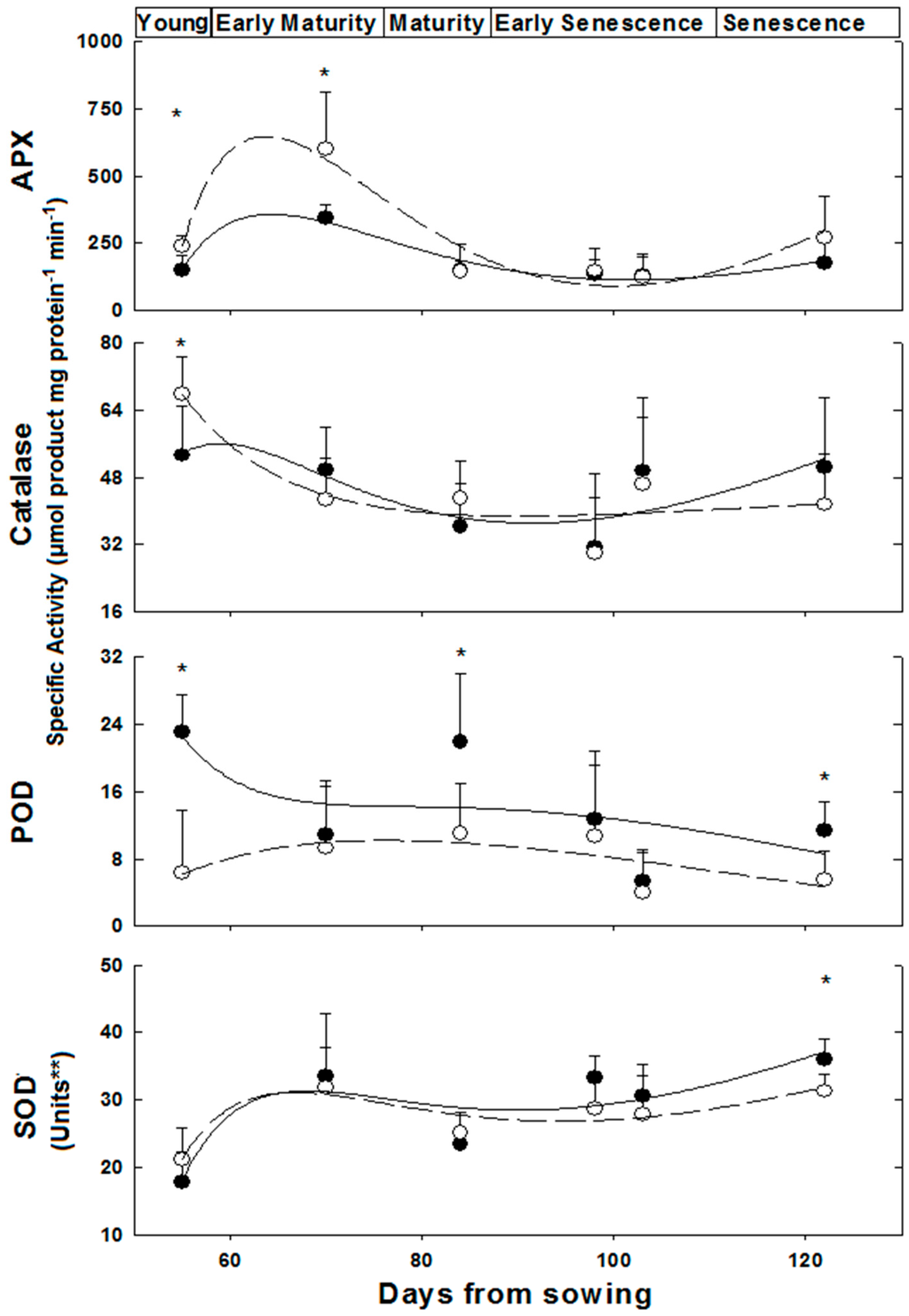 Components of the anti-oxidative system are multifunctional, in defense as well as in developmental and signaling processes [6]. For example, in both genders, POD and CAT specific activities were significantly lower (by at least 10-fold) than that of APX (Figure 2). This may indicate that POD activity plays a role in development rather than in anti-oxidative protection per se, in agreement with Asada’s (1992) [47] classification of POD as primarily involved in physiological processes distinct from H2O2 scavenging. Furthermore, the higher POD activity in male plants, throughout development (Figure 2), may be associated with the earlier initiation of senescence in that gender. Worth noting is that higher POD activity was also reported in senescing pea leaves [48].