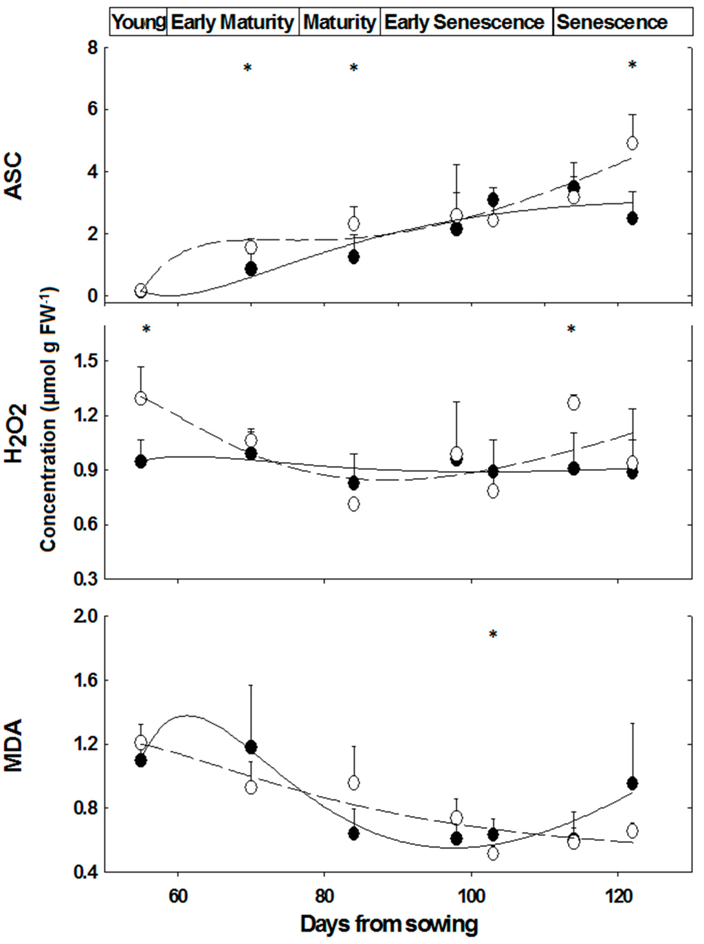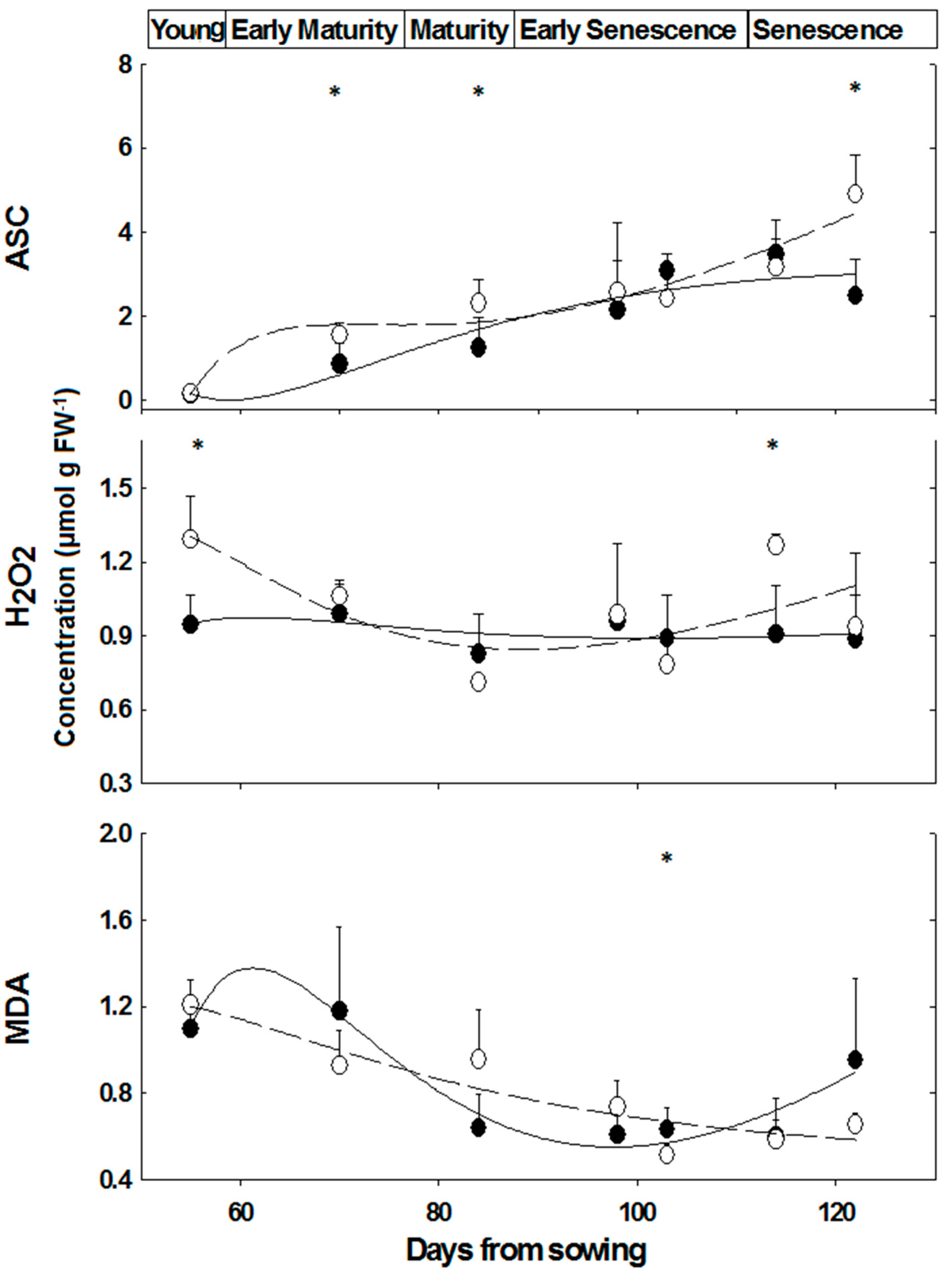 Ascorbate, hydrogen peroxide and MDA concentrations in leaves of M. annua female and male plants during development. Plants were grown in soil without salt and at the indicated time points were harvested for analysis as indicated in the Experimental Section. The data were fitted by a 3rd order polynomial curve. Ave ± SD, n = 3. Open circle—female plant; Black circle—male plant. * indicate significant difference (p < 0.05) between female and male at a given day.