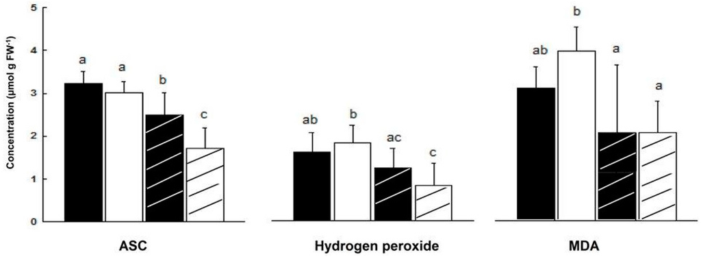 Reduced ascorbate content was measured spectrophotometrically via the reduction of Fe3+ to Fe2+ by ASC and was monitored at 525 nm [68].