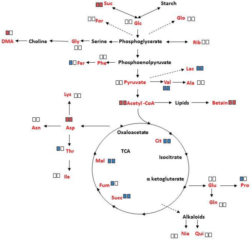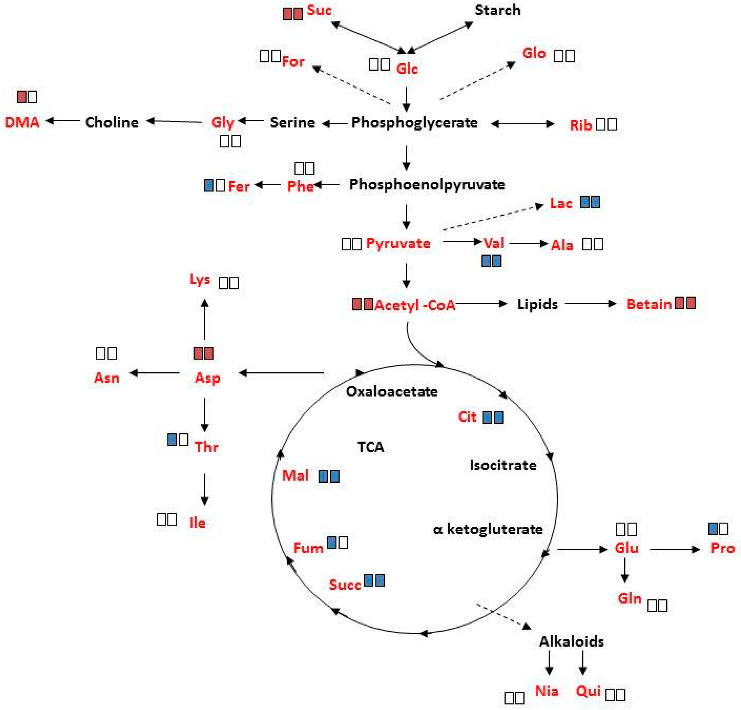 Schematic metabolic pathways showing changes in leaf metabolites concentration of ‘Young stage’ M. annua under salinity. Plant of M. annua at ‘young stage’ (55 days) were exposed to NaCl (100 mM) for 3 days. Extraction of polar metabolites from female and male leaf and root was done with perchloric acid. Left rectangle—female; right rectangle—male; red rectangle—increase; blue rectangle—decrease; Empty rectangle indicates no significant change under salinity. Significant changes at p < 0.05 are shown. Metabolites written in red were identified by 1H NMR. Metabolites written in black were below detection threshold.