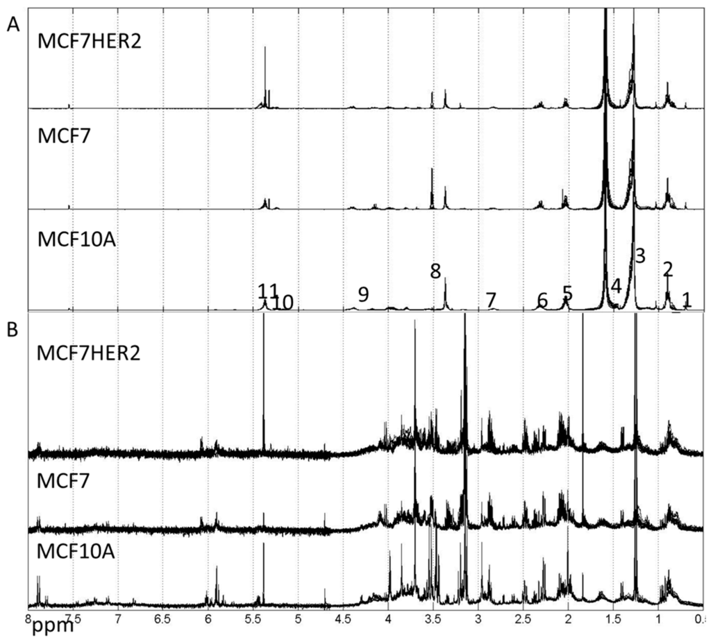 Spectra of lipophilic (A) and hydrophilic (B) metabolic extracts from MCF10A, MCF7 and MCF7HER2 cells incubated under different treatment conditions in different biological replicates measured here. (A) Labels correspond to peaks from: 1–CH3; 2–CH3 (L, Ch), CH2 (Ch); 3–CH2 (L, Ch); 4–CH2CH2COO (L) and H2O; 5–CH2CH=CH (L); 6–N(CH3); 7–Ar-H; 8–N(CH3)3; 9–CH2OCOR, CH2OPO2; 10–CHOCOR (lipids); 11–HC=CH (lipids, cholesterol). Assignment of peaks is based on [31]. (B) Hydrophilic spectra for the same three cell types. These spectra are representative of 3–5 independent experiments.