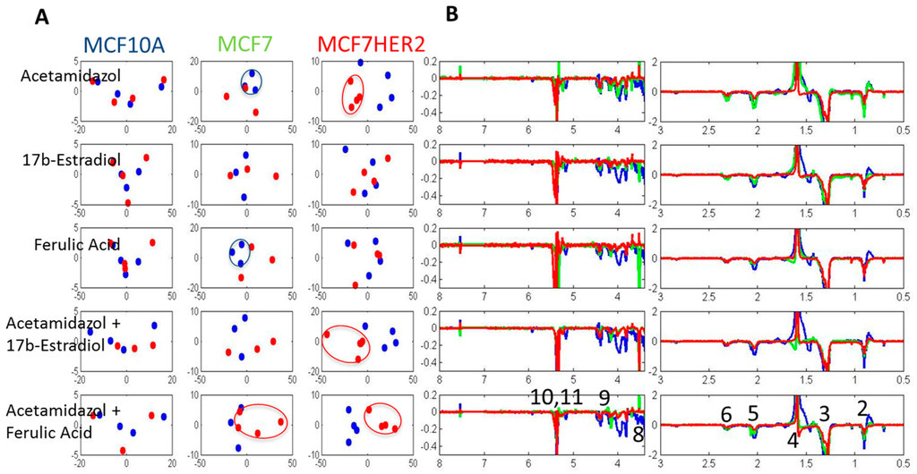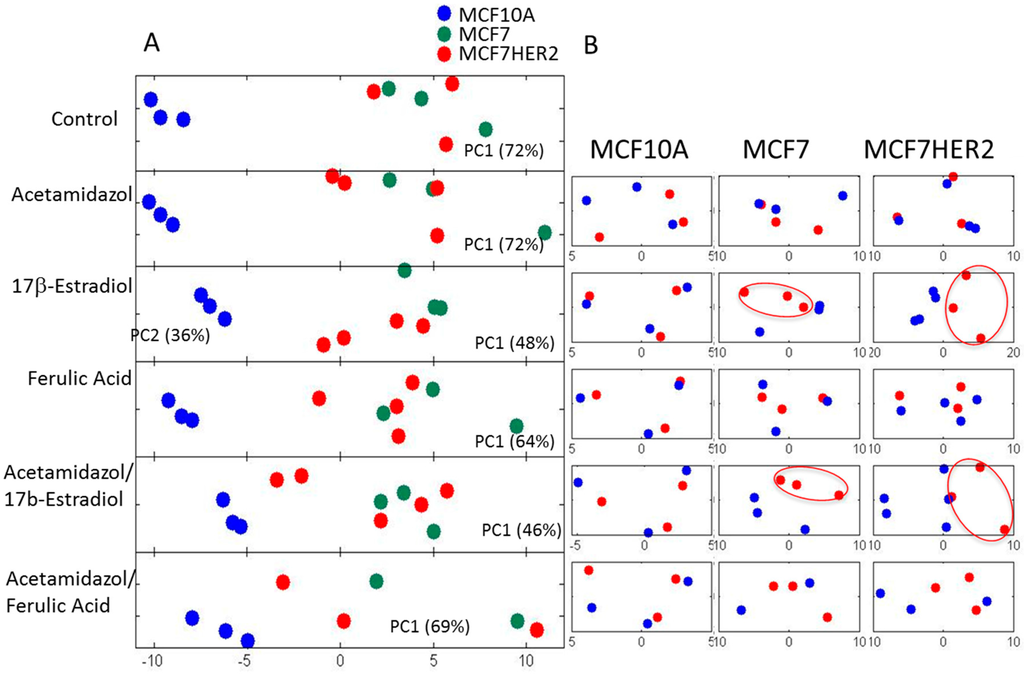 Overall metabolic profile changes are best observed from the analysis of spectra. Principal component analysis (PCA) of the measured hydrophilic metabolites for the three cell lines incubated under different treatment conditions is shown in Figure 4A. In the untreated control condition, MCF10A cells had a highly distinct profile from that of the other cell lines, with no significant difference in the major variances between MCF7 and MCF7HER2 cells. A similar overall result was observed following incubations with acetazolamide and ferulic acid. Treatment with 17β-estradiol created change in the metabolic profile between all three cell types with significantly reduced difference between MCF10A and MCF7 and MCF7HER2 cells. According to PCA shown in Figure 4A, major PC1 variance between these three groups goes from over 70% in control group to under 50% in 17β-estradiol treated cells. At the same time PC2 component shows variance between MCF7 and MCF7HER2 cells only in 17β-estradiol treated cells. Analysis of treatments and controls for each cell line (Figure 4B) show no significant effect on the overall profile in MCF10A cells for any of the tested treatments. In MCF7 and MCF7HER2 cells, 17β-estradiol once again had the most profound effect on PCA spectra when applied alone or in combination with acetazolamide resulting in significant changes from untreated controls. There was no measured effect on PCA of metabolic profiles following treatment of cells with ferulic acid or acetazolamide.