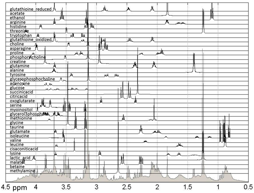 Reference spectra of metabolites used for quantification of relative concentrations of hydrophilic metabolites measured in NMR spectra. Shown are all quantified metabolites as well as the sum of NMR spectra for all samples. The spectral range from 0.5 to 4.5 ppm is shown, however the spectral range used for quantification was 0.5–9 ppm.