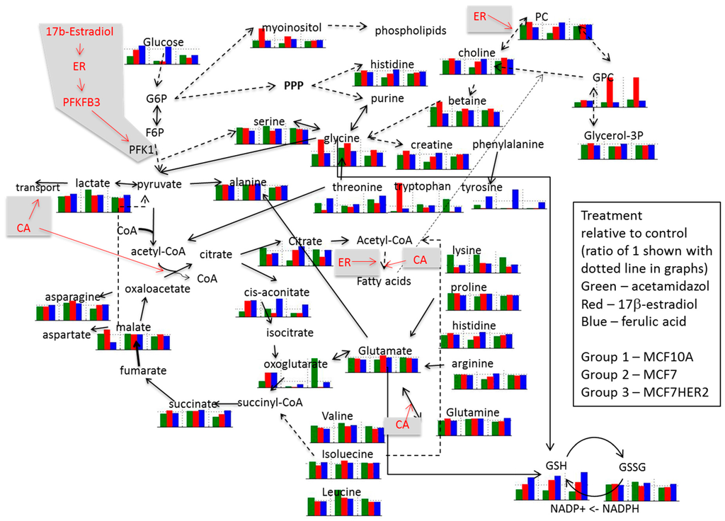 Schematic presentation of proposed effects of ER agonists and CA inhibition on metabolism. Imbedded graphs show metabolite concentration changes following acetazolamide, 17β-estradiol and ferulic acid treatment in MCF10A, MCF7 and MCF7HER2 relative to untreated controls in the same cell lines. Horizontal dotted line in each graph shows a value of 1 (relative effect value in untreated cells). Dashed arrowed lines show indirect (through several steps in the pathway) connection between metabolites; solid arrowed lines show direct pathway connection between metabolites. Values are from 3 to 5 independent experiments.
