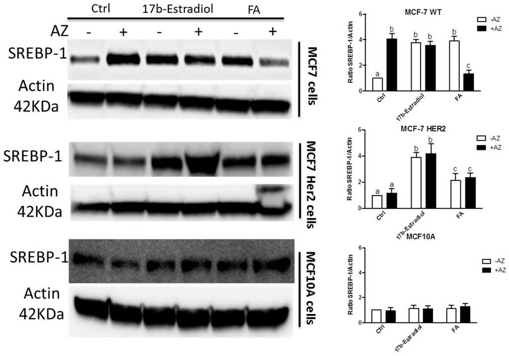 SREBP-1 expression profile in the 3 cell lines. Immunoblot analysis of SREBP-1 expression in MCF-7, T47D and MCF-10A cells incubated with 2 nM, 10 μM and 100 μM of 17β-estradiol, ferulic Acid (FA) and acetazolamide (AZ), respectively, or with vehicle EtOH and DMSO (Ctrl). The graphs show densitometry quantification of the SREBP-1 blots in the 3 cell lines. Immunoblots are representative of 3 independent experiments. Data are means ± SEM, n = 3 independent experiments. Values that have a different superscript are significantly different (p < 0.05) as determined by one-way ANOVA test with subsequent Tukey’s post hoc test.