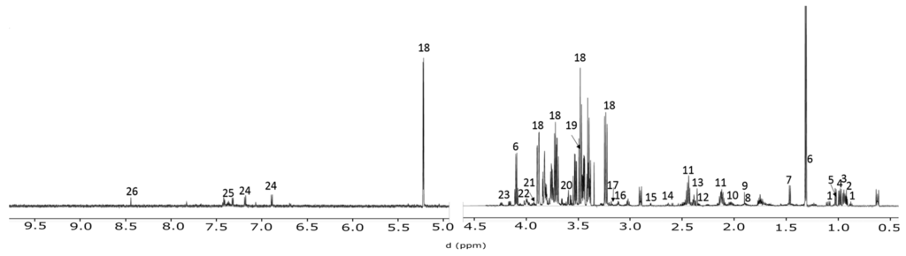 Raw FID from 1H-NMR was processed and profiled using Chenomx NMR suite 8.0. 1H-NMR data were evaluated using a targeted profiling strategy [13] that allows quantification of metabolite data in the sample.