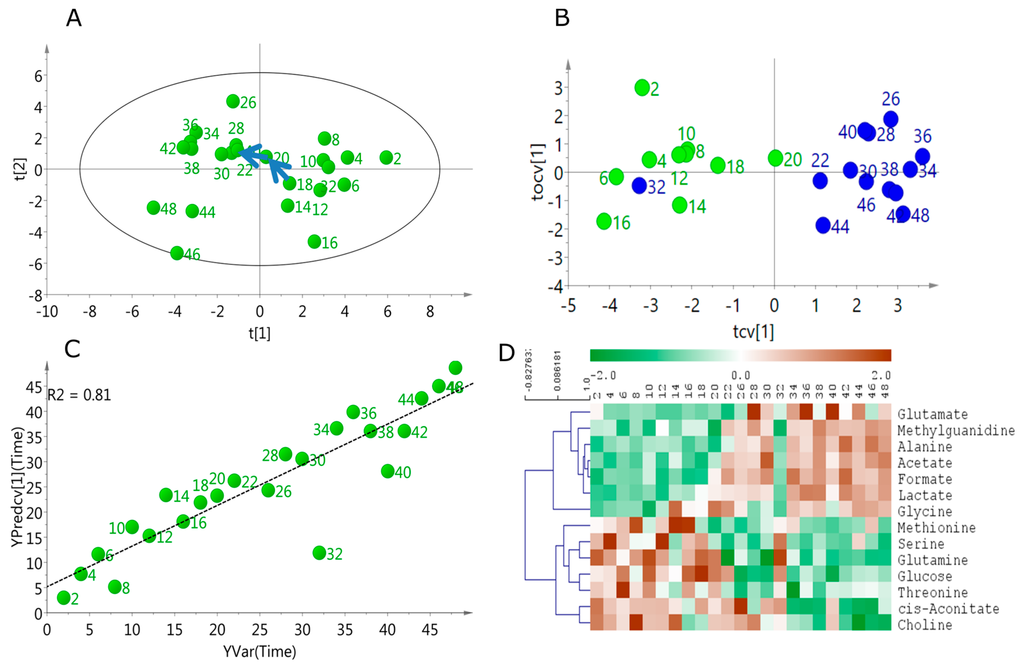 Pre-processed data were exported to SIMCA-P 14 (Umetrics AB, Umea, Sweden) for further multivariate statistical analysis. Univariate scaling was appliedto put eqal weightage to all variables. Initially, unsupervised Principal Component Analysis (PCA) was carried out to look for trends in metabolites. Further, supervised clustering was performed using Orthogonal Partial Least Square-Discriminant Analysis (OPLS-DA). In addition, regression of metabolome with time was assessed using supervised OPLS modeling. Supervised models were internally cross-validated with a 7-fold cross validation. These models were considered significant for models with cross-validated ANOVA p < 0.05. Variables were selected based on variable importance of projection (VIP), and VIP > 1 was considered significant. Due to non-availability of one time point sample (14th time point), the missing data were replaced by averaging preceding (12th) and succeeding (16th) time points.