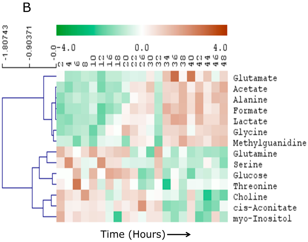 Major clusters include: (1) Metabolites of branched chain amino acids, choline and cis-aconitate; (2) amino acids and glucose; (3) malonate, methionine, myo-inositol and phenylalanine; (4) end products of cellullar metabolism; and (5) pyroglutamate, pyruvate, glycine and glycerol. The metabolites in these five clusters showed grossly similar temporal behavior (Supplementary Information S2). For example, level of branched chain amino acid (BCAA) metabolites remained broadly the same longitudinally, while choline was steadily decreased in the media. Several amino acids and glucose level in the media were depleted during 18–24 h time while the metabolic end products were steadily increased in the media.