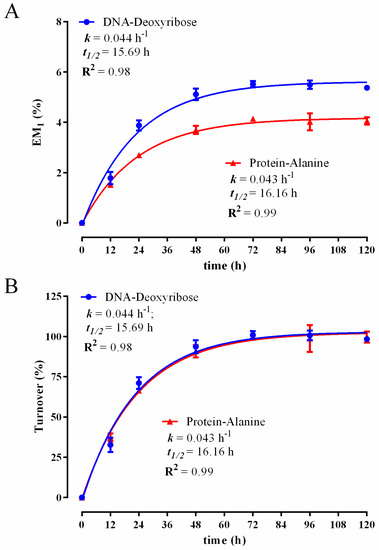 Half-life (t1/2) represents the time taken for the specific metabolite pool to be half turned over, i.e., the time taken to achieve 50% of EM1(max). In the case of DNA synthesis, the t1/2 of enrichment in DNA-derived deoxyribose represents the cell doubling time, i.e., after one cell division event, two DNA strands have been duplicated, resulting in two original DNA strands and two new ones (50% unlabelled and 50% labelled) [35]. Thus, the lower the half-life, the more rapid the rate of synthesis is. The half-life is calculated by the following equation: