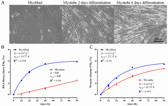 Comparison of 2H-incorporation into DNA-derived deoxyribose and protein-derived alanine in C2C12 myoblasts and myotubes following incubation in 4% 2H2O treatment over 96 h. Representative images of myoblast and differentiating myotubes (A); excess molar enrichment in the M1 isotopomer (EM1) over time in DNA-derived deoxyribose (B) and protein-derived alanine (C) in myoblasts and myotubes. Inset: fractional synthesis rate constant (k), half-life (t1/2) and goodness-of-fit (R2) from non-linear curve fitting. Two replicates were performed for each time point. Error bars represent the standard error of the mean (SEM).
