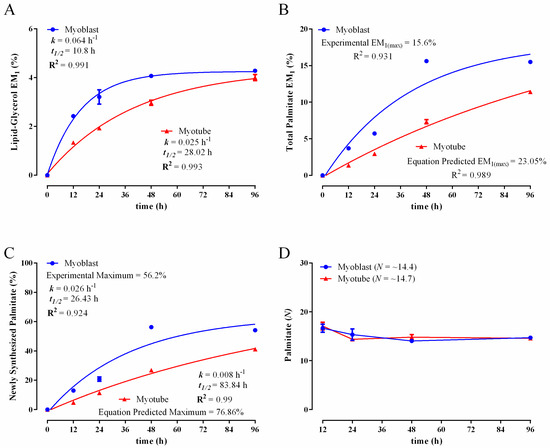 Comparison of 2H-incorporation into lipid-derived glycerol and total palmitate in C2C12 myoblasts and myotubes following incubation in the presence of 4% 2H2O. Excess molar enrichment in the M1 isotopomer (EM1) over time in lipid-derived glycerol (A) and total intracellular palmitate (B) in myoblasts and myotubes. Percentage of newly-synthesized palmitate in myoblasts and myotubes (C). The experimental maximum (plateau) value represents the percentage of the total intracellular palmitate pool that was de novo derived. For myotubes, given that plateau values were not experimentally achieved, this value was equation predicted. The maximum number of exchangeable carbon bound hydrogens (N) in palmitate as determined using mass isotopomer distribution analysis (MIDA) (D). Inset: fractional synthesis rate constant (k), half-life (t1/2) and goodness-of-fit (R2) from non-linear curve fitting. N values seen in the brackets of the legend (D) are an average of those obtained at the 48- and 96-h time points; these exhibited the greatest amount of labelling and, therefore, permit the most accurate calculation of N using MIDA. Two replicates were performed for each time point. Error bars represent the standard error of the mean (SEM).