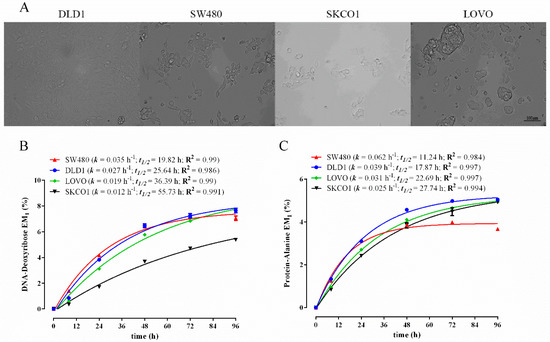 Comparison of 2H-incorporation into DNA-bound deoxyribose and protein-derived alanine in colon cancer cell lines following incubation in the presence of 5% 2H2O over 96 h. Representative images of colon cancer cell lines (A). Excess molar enrichment in the M1 isotopomer (EM1) over time in DNA-derived deoxyribose (B) and protein-derived alanine (C) in human colon cancer cell lines grown under identical conditions. Inset: fractional synthesis rate constant (k), half-life (t1/2) and goodness-of-fit (R2) from non-linear curve fitting. Three replicates were performed for each time point. Error bars represent the standard error of the mean (SEM).