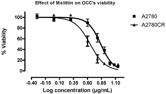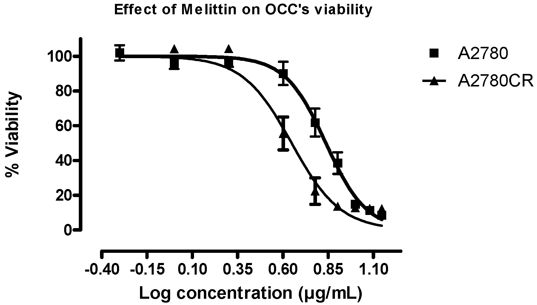 Effect of melittin on the viability of the ovarian cancer cells A2780 and A2780CR. Cell viability was determined following treatment with varying doses of melittin for 24 h (IC50 = 6.8 µg/mL A2780; IC50 = 4.5 µg/mL A2780CR).