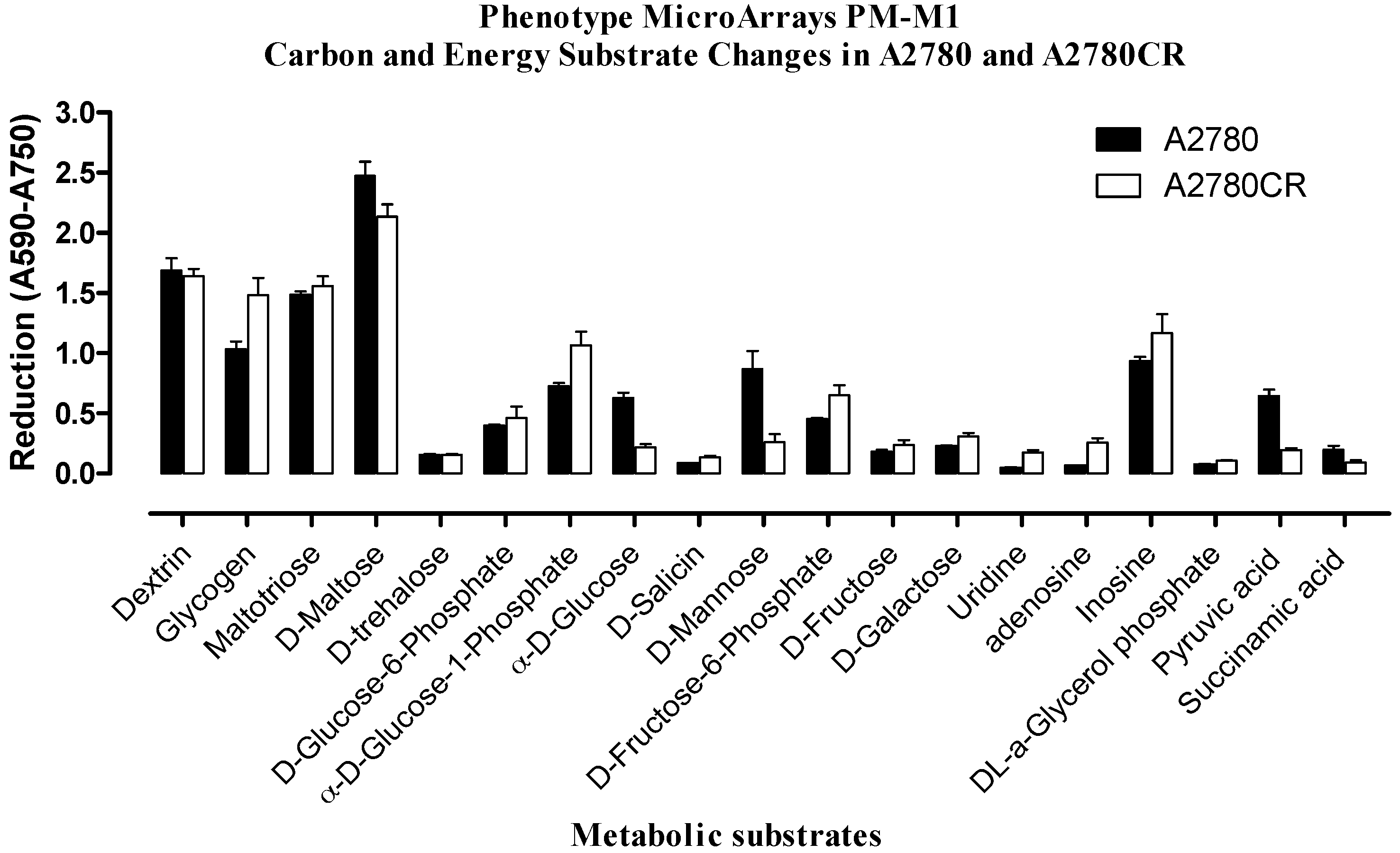 The cells were tested by using standard protocols for metabolic phenotype microarray-mammalian (PM-M) cell assays (Biolog, Hayward, CA, USA). In order to select the proper dye mix, an optimisation experiment was performed in order to determine which of the two Biolog redox dyes (MA or MB) was most appropriate for phenotypic microarray (PM) assay of both A2780 and A2780CR cells. Figure S2 shows the layout of the carbon sources in the PM-M1 microplate. Figure S3 shows the colours which developed in the plates after inoculation with A2780 and A2780CR cells in the presence and absence of melittin. Figure 2 indicates the extent of utilisation of the different carbon sources by the resistant and sensitive cells. A number of the carbon sources were used by both cell lines. However, many of the substrates in the microarray plate do not appear to be useful as carbon sources. There were clear phenotypic differences and the A2780CR cells would appear to have a slightly more active glycolytic pathway as judged by the rate of utilization of glucose and fructose phosphates, although the rates of glucose and pyruvate utilisation were higher in the A2780 cell line. Inosine also appears to be a very favourable carbon source and is used by the A2780CR cells to a greater extent than by the A2780 cells. Neither Krebs cycle intermediates nor short chain fatty acids appear to be useful as carbon sources underlining the dependence of both cell lines on glycolysis, which is generally the case in cancer cell lines [2].