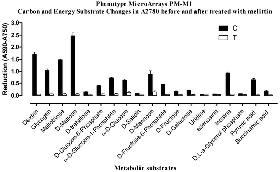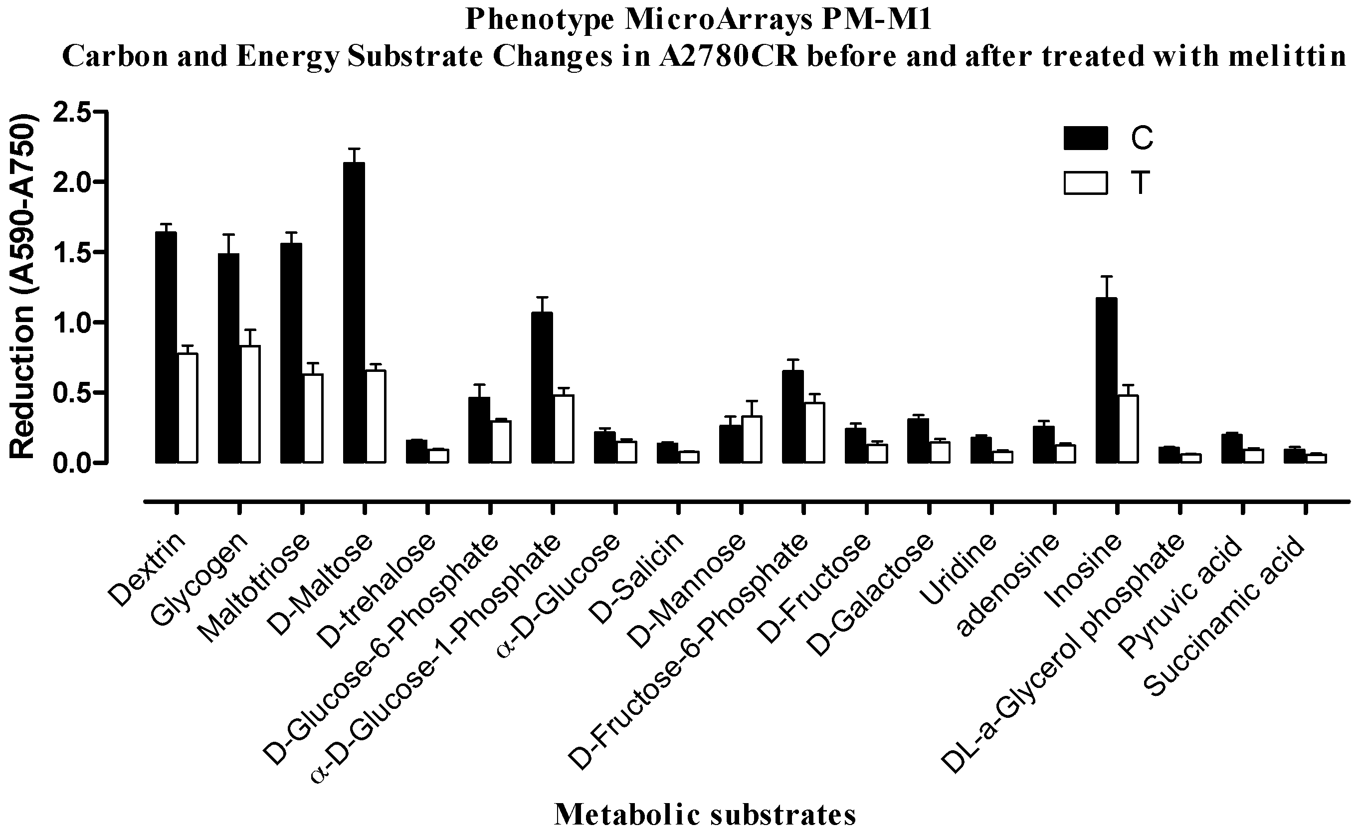 Comparison of substrate metabolism in A2780CR cells following melittin exposure. Dye reduction rates calculated following 24 h incubation of cells with melittin at IC50 (4.5 µg/mL) concentration. C = untreated controls; T = melittin treated.