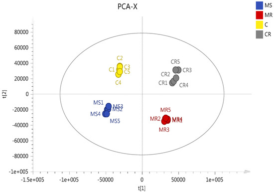 Multivariate data analysis of the ovarian cancer cells A2780 and A2780CR treated with melittin. PCA scores plot generated from PCA using LC-MS normalised data of treated cells and controls. MS circles: A2780-treated cells; C circles: untreated A2780 cells; MR circles: A2780CR -treated cells; CR circles: untreated A2780CR.