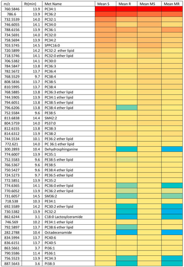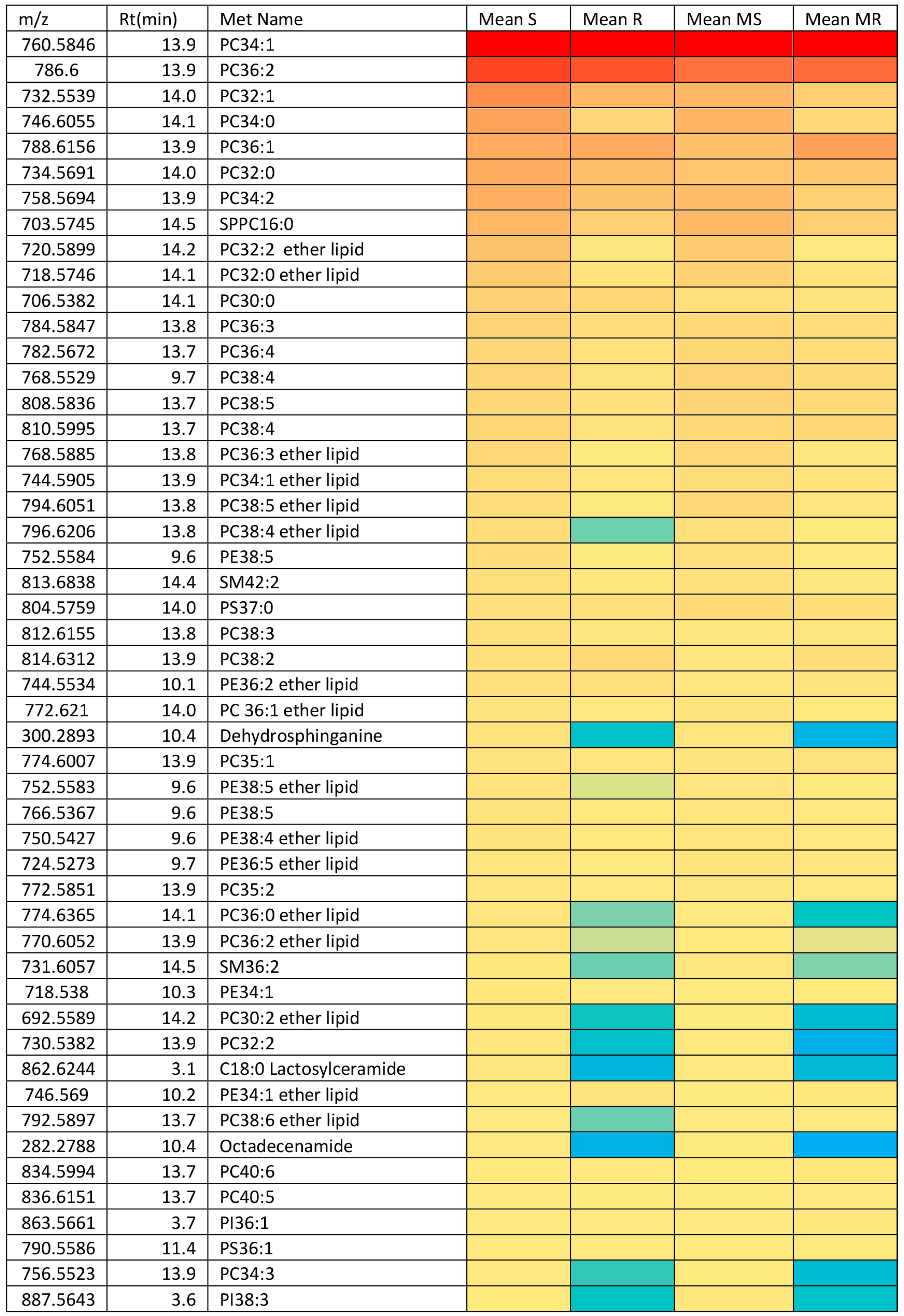 Heat Map showing the relative abundance of lipids in A2780 (S), A2780CR (R) and melittin treated (MS & MR) cells. Red = 5 × 107, Yellow = 8% of highest value, Blue = 0%.