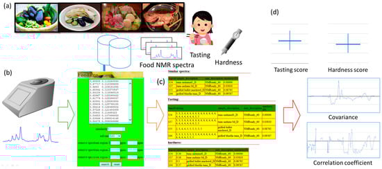 Several analytical approaches tend to focus on a specific class of compounds or on a single compound important for evaluating foodstuff quality, nutritional properties, and sensorial characteristics. This type of analysis, also called “target analysis,” usually requires specific extractions and sample pretreatment. In contrast to this, NMR spectroscopy has gained an important role among the various analytical techniques used to analyze foodstuff owing to its “high-throughput” nature and high analytical precision []. Many applications have been reported in the literature showing the potential of an NMR-based approach to investigate the geographical origin, quality control, and processing of foodstuff [,,]. In addition, different fish metabolites determining fish quality, taste, etc., may be simultaneously monitored and qualitatively described, making NMR spectroscopy a valid (and in many aspects, unique) tool to characterize the metabolic profile and properties of fishes [,]. A further advantage of NMR-based approaches is simpler and more direct sample preparation compared with that required for other analytical methods, which may involve derivatization or column chromatography. In this study, we demonstrated its practical use for food process characterization via bench-top NMR, which is a cost-effective instrument to evaluate foodstuffs []. In summary, we have developed FoodPro, a novel web-based tool that can search the food NMR spectrum database and compute estimated tastings, hardnesses, covariance, and correlation spectra. FoodPro is systematically designed for accepting versatile data other than tasting or hardness, and thus, can be easily extended to other indices. Combining the high-throughput nature of NMR with easy sample preparation, further accumulation of data and refinement of the web-tool function might contribute to the on-site characterization of foodstuff and processing in the future.