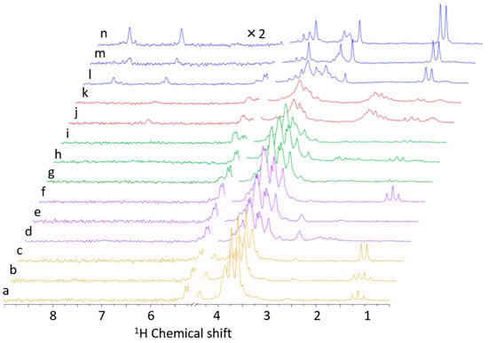 Among the 367 total NMR spectra of foodstuffs deposited in the FoodPro database, typical stacked plots are shown in Figure 2 for D2O (Figure S2 in Supplementary Materials for CDCl3). From bottom to top, orange Figure 2a–c are a series of different durations of milk fermentation with yogurt, purple Figure 2d–f are fruits, green Figure 2g–i are vegetables, brown Figure 2j,k are ramen soups and blue Figure 2l–n are fish muscles. Overall, fish showed characteristic metabolites such as lactate (1.31 ppm, doublet), creatine (3.03 and 3.92 ppm), trimethylamine N-oxide (TMAO) (3.26 ppm), and histidine (7.28 and 7.89 ppm). In contrast, ramen soup exhibited characteristic signals of glutamic acid (2.1–2.3 ppm, multiplet), which may be an additive for enhancing umami taste. Other sugar-rich foodstuffs (vegetables, fruits, and yogurt) showed characteristic large peaks between 3.2 and 5.6 ppm, whereas milk with yogurt exhibited a different peak pattern of sugar signals due to a different main component (lactose). Furthermore, fermented products (ethanol triplet at 1.17 ppm in Figure 2a) contained lactate after 6 h in Figure 2b and were completely converted by 20 h in Figure 2c. Therefore, the bench-top NMR (60 MHz) can be used to monitor chemical reactions and compositional changes during food processing.
