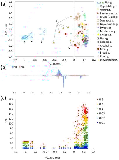(a) Principal components analysis (PCA) score plot for PC1 and PC2 with 236 D2O spectra. Note that symbol names represent broad types of processed foods such as fermented or cooked (e.g., Fish g means a fish group). The fish group is classified into six groups (1–6, light blue triangles). These are further divided into three groups filled in white, orange, and yellow; (b) PCA loading plot for PC1 (blue) and PC2 (red); (c) Search sensitivity. Number of hits in the database vs. PC1 score are shown. Similarity thresholds are 0.01 (dark blue), 0.02 (light blue), 0.05 (dark green), 0.1 (light green), 0.2 (orange), and 0.3 (red). A point corresponds to a query NMR spectrum that has a PC1 score the same as that in Figure 3a.