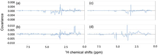 The 18 hits searched with the raw Japanese seabass had 15 hits registered with hardnesses. They resulted in a covariance spectrum to hardness (Figure 4c). As a result, positive covariance to hardness at 3.26 ppm that is from TMAO, which is known to control osmotic pressure in fish [,]. This means that a higher level of TMAO corresponded to higher hardness in the fish group 1. We could also observe that this group had a higher level of TMAO than the fish group 3 (Figure 3a, around −0.6 of PC1, including bluefin tuna). Finally, we describe an example for salmon roe. Although salmon roe originates from fish, it was on the right side at +0.2 of PC1 (fish group 6). It was, in fact, closer to liquor mash or vegetables groups than the fish groups. Querying the salmon roe spectrum (0.05 of similarity threshold, nine hits of which five hits registered tastings) resulted in a covariance spectrum to tasting (Figure 4d). It was detected that a positive covariance to tasting at 3.47 ppm existed, which is for glucose. This is an example in which we could extract a peak of sugar with the covariance spectrum for tasting from multiple NMR spectra associated with processed and cooked foods.