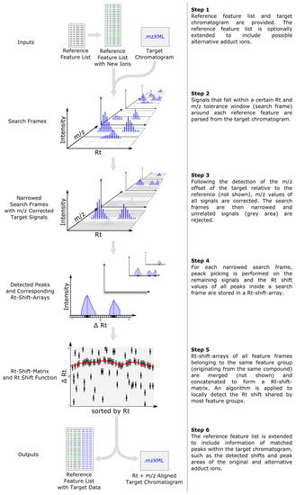 Workflow depicting the main data processing steps of MetMatch for a single target chromatogram. If more than one target chromatogram is going to be processed, each of those is successively carried through the steps 2–5 and a single data table containing the (extended) reference list as well as the matched features of every target chromatogram is generated. After processing of the target chromatograms, all new information (chromatographic peak area, corrected m/z value and retention time, calculated m/z and Rt shift) for each reference feature and processed target chromatogram are saved as an extended data matrix. Moreover, the target chromatograms can optionally be saved as m/z- and Rt-shift-corrected mzXML files.