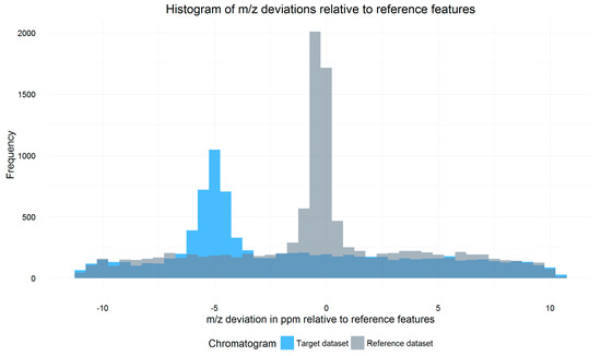 Overlay of two histograms showing the distribution of the weighted average mass to charge ratio (m/z) shifts of all search frames of a target file (blue) relative to a reference file (grey). The baseline frequency of about 200 is caused by unrelated signals, which have a random m/z shift relative to their respective reference feature. The m/z shift of signals corresponding to reference features is, however, not random and shows a significant increase around the systematic m/z offset of the respective file relative to the reference. This causes a maximum around the aforementioned offset. For the illustrated target datafile, this m/z offset was determined to be −5 ppm.