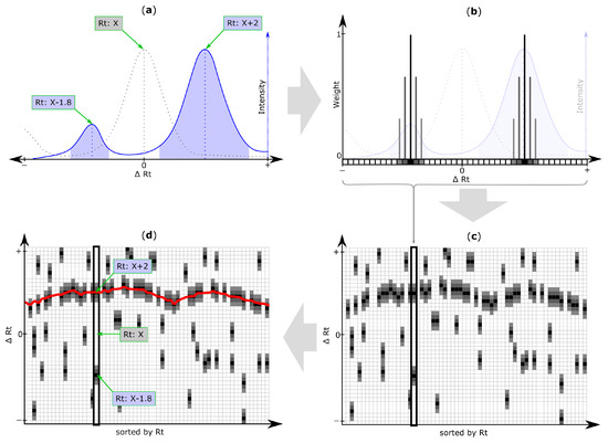 Retention time (Rt) shift detection procedure: (a) Extracted ion chromatogram (EIC) of a target chromatogram (blue solid line) with two chromatographic peaks (blue areas) and their peak apexes or centers (blue dotted line), depending on the selected peak picking algorithm. Determination of the chromatographic peak that correctly matches the reference peak (grey) is non-trivial, as the actual Rt shift is unknown; (b) All chromatographic peaks detected within a search frame are considered to be putative matching peaks and their Rt deviation relative to the original reference feature is discretized through binning. The resulting array of Rt shift bins is referred to as Rt shift array and is non-zero for all Rt shift bins at which—depending on the selected peak picking algorithm—the apex or center of the respective chromatographic peak has been detected. By default, the retention times of peaks are assigned a weight of 1 (black cells) and bins within a certain tolerance around the peak apex (or center respectively), are assigned linearly decreasing weight values (grey squares). All Rt shift arrays of search frames belonging to the same feature group (and therefore the same metabolite) are merged into a single array (step not shown); (c) All feature group Rt shift arrays are then sorted according to the Rt of their respective reference feature group and are concatenated column-wise to form the Rt shift matrix. Any non-zero entry in this matrix corresponds to the Rt shift (∆Rt) of a peak detected within a specific feature group (i.e., column) of the inspected target file. A region of higher density of putatively matching peaks marking the most probable Rt shift across the inspected chromatogram is clearly visible; (d) The Rt shift detection algorithm of MetMatch identifies this region of higher peak density by iteratively optimizing a function (red line) to be as close to as many peaks as possible, as outlined in Figure 4. This function is then used to determine the correctly aligned chromatographic peaks relative to their reference list entry. In the depicted case the aligned peak from the target chromatogram is X + 2.