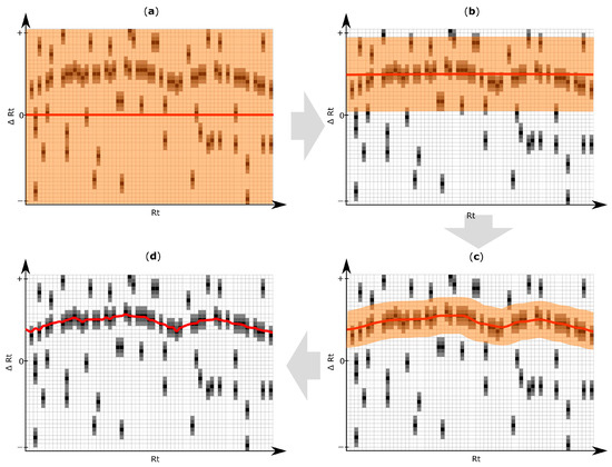 Exemplification of results obtained with the iterative retention time (Rt) shift detection algorithm. For improved illustration, only a certain part of the Rt shift matrix is depicted. (a) After construction of the Rt-shift matrix of the inspected target chromatogram (Figure 3a,b), the Rt shift function (red line) is initially constructed assuming no apparent shift (∆Rt = 0). The orange area highlights the maximum allowed Rt deviation which may be used in the next iteration step; (b–d) Three successive iteration steps were applied to model the most likely Rt shift of the target chromatogram relative to the reference feature list. The Rt shift matrix used in this exemplification consists of 45 rows and 63 columns. The three iterations of the Rt shift detection algorithm were using a row tolerance (orange area) of 23, 9 and 4 rows, and a column tolerance of 41, 4 and one column, respectively. Each iteration gradually adjusts the retention time correction function more to the region of higher peak density, which finally results in an optimal alignment maximizing the number of correctly aligned chromatographic peaks. The pseudocode of the algorithm for elucidation of the Rt shift correction function is listed in Supplementary Materials Figure S1.
