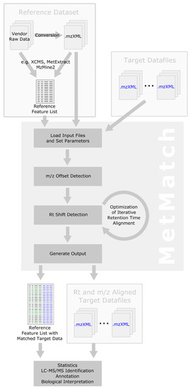 In this respect, MetMatch is a novel software tool for the comparison of LC-HRMS data utilized through a convenient user interface. Chromatograms are matched to a feature list, which can be created manually or by processing one or multiple datafile(s), which serves as a reference. Constant shifts in m/z are automatically detected and corrected for. Both linear and non-linear Rt shift correction is achieved using a fast, iterative algorithm based on the observation that metabolites/compounds exhibiting similar Rt values within a measurement usually share analogous Rt shifts between measurements. Furthermore, MetMatch is able to account for the formation of different ion species that may be formed under slightly differing experimental conditions. The developed software offers a convenient graphical user interface that allows for easy optimization and verification of every processing step.