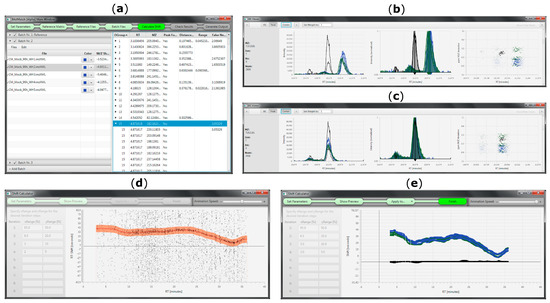 MetMatch’s user interface during various processing steps. (a) Main window showing the reference feature list and all loaded datafiles. The step indication bar on top helps the user to keep track of the data processing and also serves as a menu bar; (b) EICs of reference (black) and target datafiles (blue, green) before Rt alignment; (c) Overlay of EICs after Rt alignment; (d) Animated Rt shift detection algorithm (animated version available at [26]; (e) Overlay of Rt shift functions calculated for multiple target datafiles.