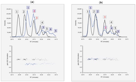 EIC (alignment before and after retention time (Rt) alignment and mass-to-charge ratio (m/z)) correction with MetMatch. (a) A phenylalanine-derived chromatographic peak was annotated at position 3 in the reference file (black) and thus included in the reference feature list. The target peak (blue) at position 2 would probably be matched to it by means of manual matching or any other alignment approach that does not account for Rt shift; (b) Extracted ion chromatograms (EICs) after Rt and m/z shift correction using MetMatch. When the two corrected EICs are viewed simultaneously, it is apparent that each target peak should be matched to the reference peak denoted by the same ID number and that a systematic m/z shift is present between the two chromatograms.