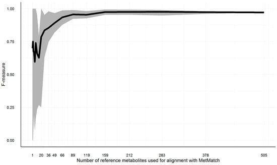 Illustration of the F-measure range (grey area) and average (black line) for reference feature lists of decreasing size. To estimate the minimum number of entries in the reference feature list, a simulation was carried out. In total, 200 subsets of decreasing size were generated. For each of the generated subsets, the m/z and Rt alignment step was calculated with MetMatch. The minimum (lower border of grey area), average (black line) and maximum (upper border of grey area) values are illustrated for each of the iterations.