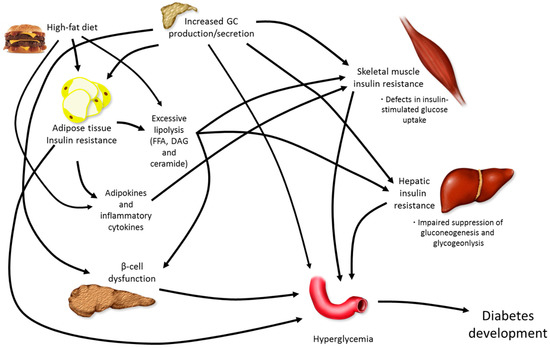 Pathophysiology of diabetes development. The development of overt diabetes occurs through a number of mechanisms, all of which work together to affect elevations in blood glucose, ultimately causing hyperglycemia. Glucocorticoids (GC), free fatty acids (FFA), diacylglycerol (DAG).