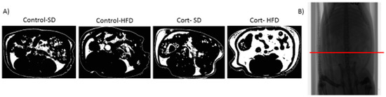 Micro-computed tomography shows that corticosterone and a high-fat diet caused increased abdominal fat. (A) A representation of abdominal fat from a representative rat from each group is shown; (B) A whole rat radiography with the ROI (region of interest) used. Standard diet (SD), high-fat diet (HFD), corticosterone (Cort).
