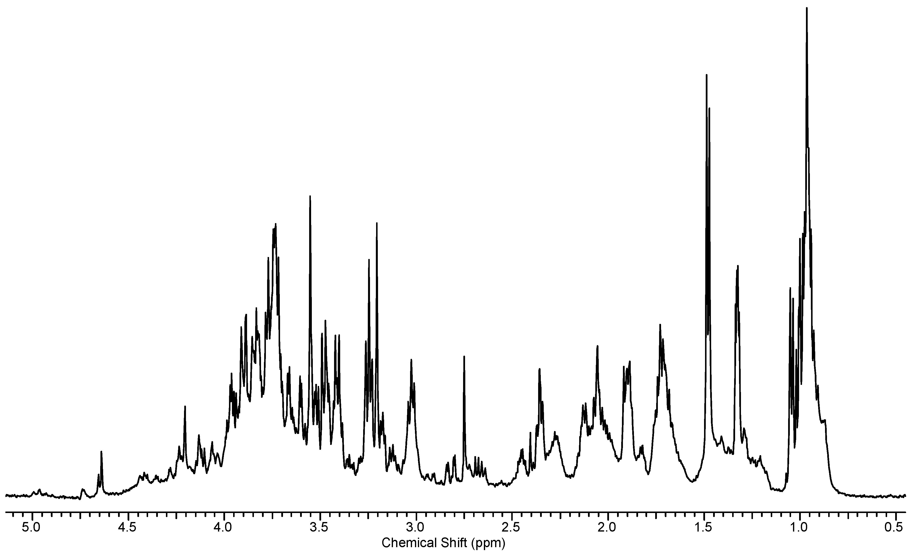 Since NMR/MRI based approaches allow for the quantification of metabolite concentrations of intact tissue, either in vivo [57] or ex vivo [58], the majority of metabolomics studies use one-dimensional (1D) proton (1H) NMR spectroscopy of cell or tissue extracts as the primary method of analysis. Because the 1H is abundant in biological molecules, and is also the second most NMR sensitive nucleus (after tritium), this method will be discussed here. A typical 1D 1H spectrum is illustrated below in Figure 1, in this case from an extract of the water flea, Daphnia magna. While many spectra are better resolved that that in Figure 1 they still show a multitude of overlapping peaks, which must all be assigned to specific metabolites present in the sample if useful data is to be obtained and interrogated.