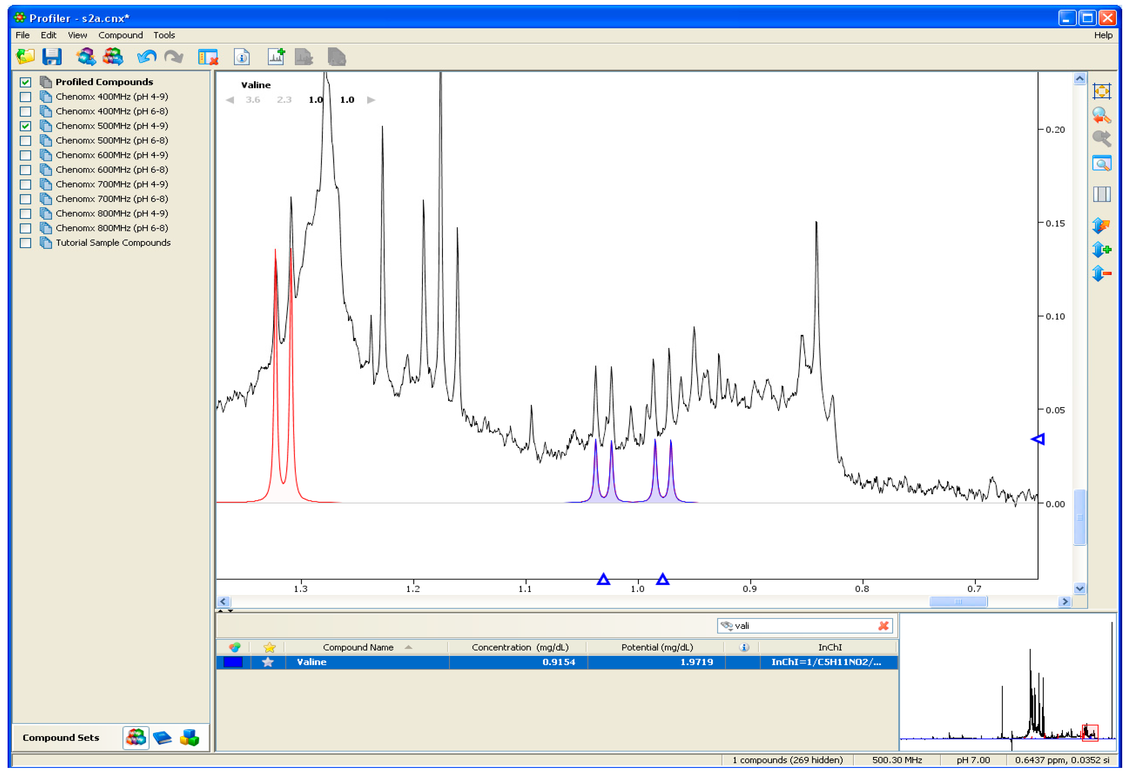 The development of large spectral libraries such as that of the HMDB [59], which contains the peak patterns and chemical shift values for thousands of metabolites, has greatly facilitated the identification and characterization of metabolites. For example, the development of software tools such as Chenomx NMR profiler™ (Edmonton, AB, Canada) allows the 1H spectra of the sample to be overlaid with spectra of known metabolites, so that over time a pseudo-spectra is built up that matches that of the sample [60], as shown in Figure 2. Although comparatively expensive and somewhat resource intensive, the Chenomx software can identify and quantify hundreds of small molecules. In its most recent update, Chenomx now offers data for compounds from the HMDB library. A similar tool, Mnova™ by Mestrelab Research (Santiago de Compostela, Spain) allows a wide range of functions on its desktop form and also comes in a tablet version.