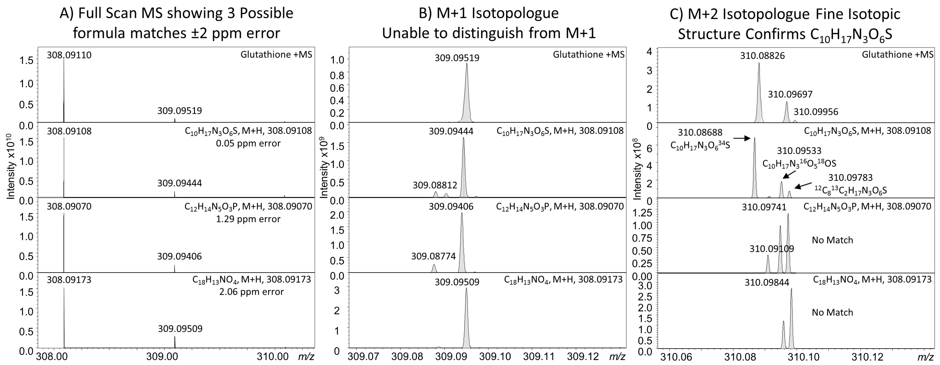 Identification of molecular formula using uHRMS in combination with isotopic fine structure: (A) Full Scan MS+ spectra for a glutathione standard showing three calculated formula matches within 2 ppm mass error; (B) Expansion of m/z 309.07–309.13 showing M + 1 isotopologues and inability to determine parent formula; (C) Expansion of m/z 310.06–310.13 showing M + 2 isotopologues with calculated isotopic fine structure match of 34S, 18O and 13C2 isotopologues to C10H17N3O6S matching the glutathione standard, other formula fine structures do not match the same isotopologue profile.