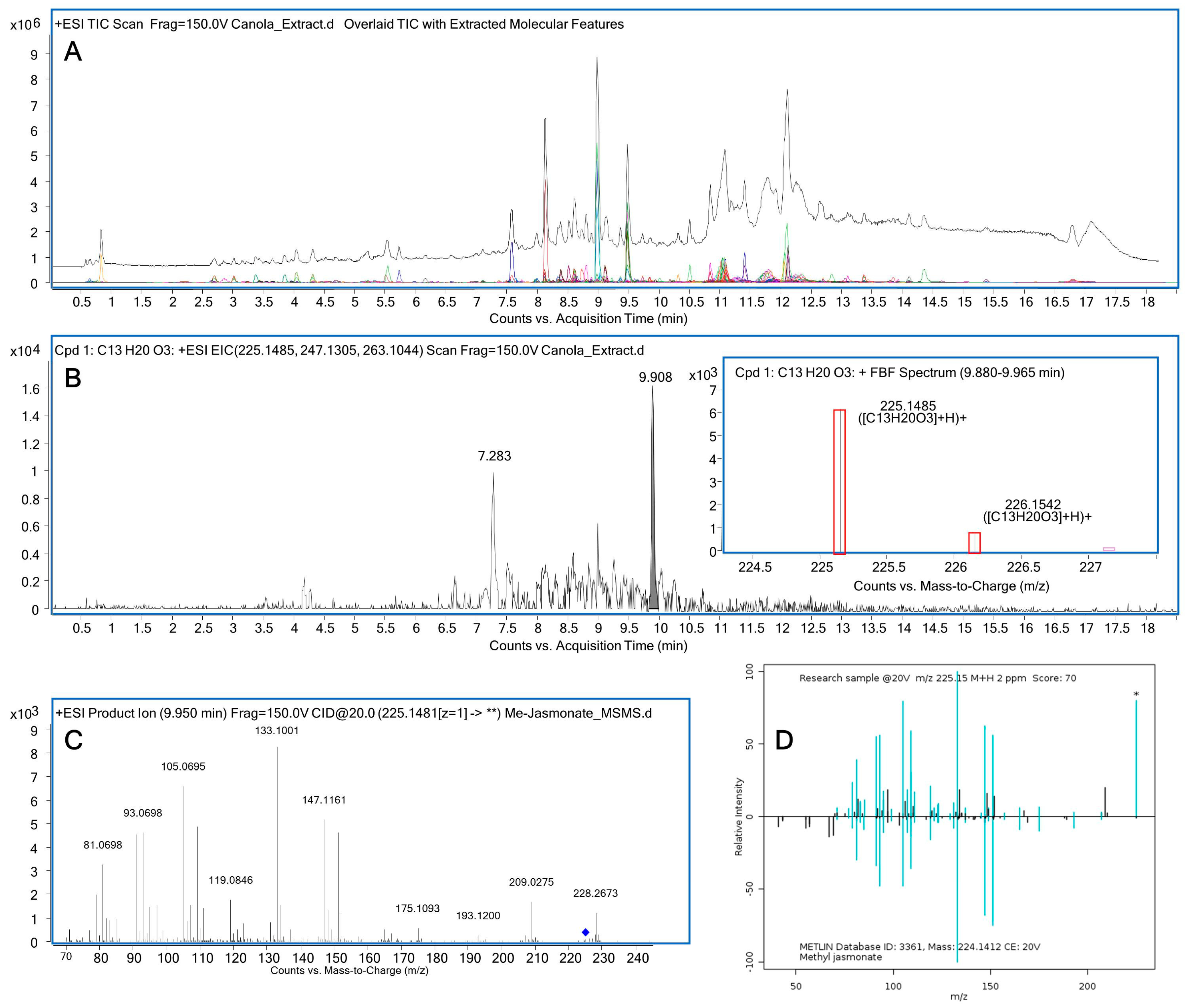 Dereplication and identification strategy using Liquid Chromatography Mass Spectrometry: (A) Reverse Phase ESI+ Total Ion Chromatogram with overlaid Extracted Molecular Features of Canola Extract; (B) Extracted Ion Chromatogram of the molecular formula corresponding to the plant hormone methyl jasmonate with inlaid Find-by-Formula Spectrum showing observed and predicted isotopic abundance for the feature at 9.880–9.965 min; (C) Product Ion spectra of methyl jasmonate using collision voltage of 20.0 eV; (D) Spectral match of methyl jasmonate MS/MS spectra to the METLIN Database allowing Putative identification.