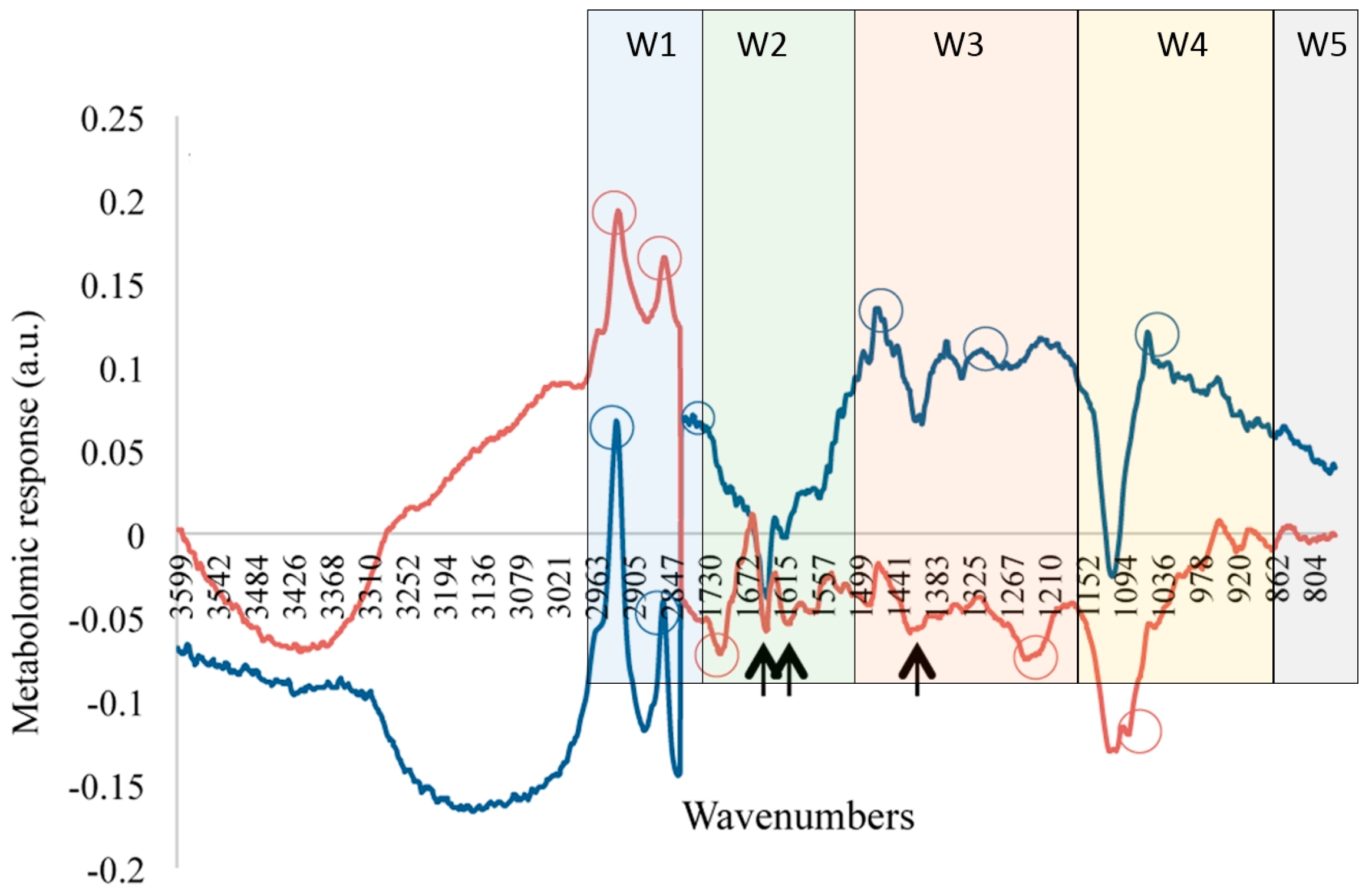 Comparison between the FTIR Response Spectra of E. coli and L. innocua at the surfactants concentrations of N-tetradecyltropinium bromide that resulted in 100% mortality. Note: a.u. stands for “arbitrary units”. Arrows correspond to the wavenumbers referred to peptidoglycan while circles to the wavenumbers referred to the major response peaks in each species. Blue, L. innocua; Red, E. coli. The synthetic stress of the metabolomic stress response are defined by the following FTIR regions: fatty acids (W1) from 3000 to 2800 cm−1, amides (W2) from 1800 to 1500 cm−1, mixed region (W3) from 1500 to 1200 cm−1, carbohydrates (W4) from 1200 to 900 cm−1 and typing region (W5) from 900 to 700 cm−1. Adapted from Corte et al. [125].